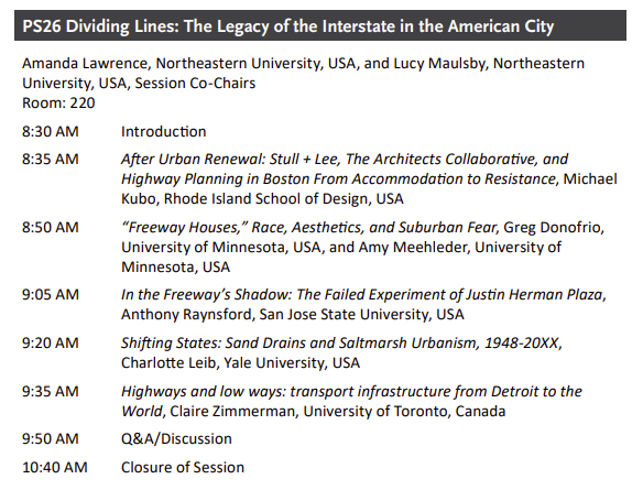 Lucy Maulsby and Amanda Lawrence organized a session at the Annual Society of Architectural Historians Conference in Atlanta in May 2025 exploring the legacy of the highway in American cities. Entitled “Dividing Lines” the session included scholars Michael Kubo, Greg Donofrio and Amy Meehlede, Anthony Ransford, Charlotte Leib, and Claire Zimmerman, each of whom presented presented their research on Boston, St. Lewis, San Francisco, the meadowlands of New Jersey, and Detroit respectively.
